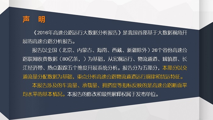 交通運輸部科學研究院、綜合交通大數據應用中心起草的《2016年中國高速公路運行大數據分析報告》系列二:高速公路物流通道運行分析,以(北京、內蒙古、海南、西藏、新疆除外)26個省份高速公路聯網收費數據(80億條)為基礎,通過流量分配等技術處理,系統詮釋高速公路物流通道運行規律和貨運特征,揭開物流通道運行效率、運輸動態和服務水平。
