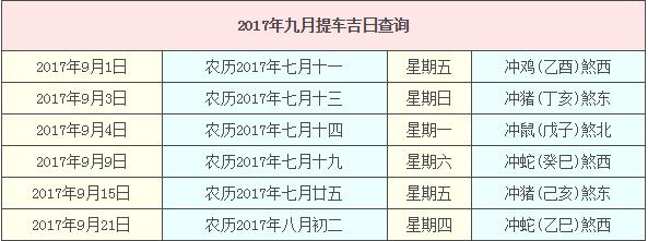 2017年9月提車(chē)吉日查詢,2017年9月提車(chē)吉日一覽表