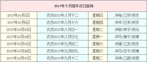 2017年10月提車(chē)吉日查詢,2017年10月提車(chē)吉日一覽表
