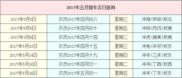2017年5月提車吉日查詢,2017年5月提車吉日一覽表